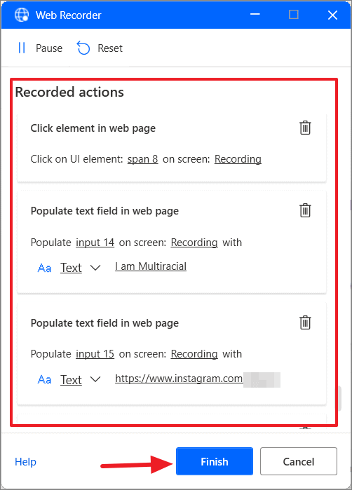 - Once you have completed all the steps, click the Finish button on the Web recorder.