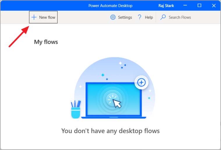 - In the Power Automate Desktop window, click on the + New Flow button at the top left corner.