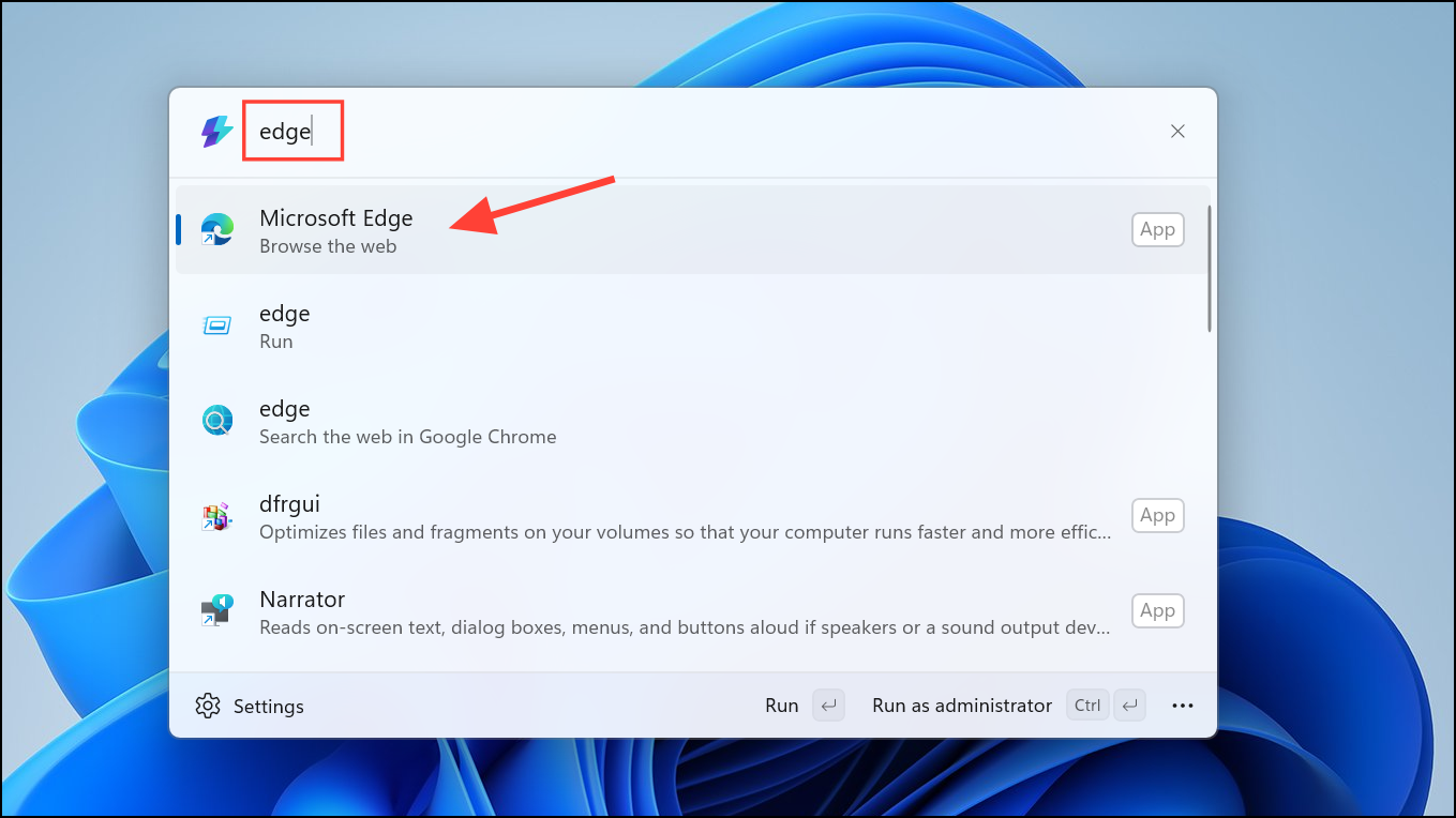 Step 2: Begin typing the name of the application, file, or command you wish to execute. The Command Palette dynamically filters results as you type, displaying matching items instantly. For example, typing "Edge" will instantly display Microsoft Edge along with other relevant results.
