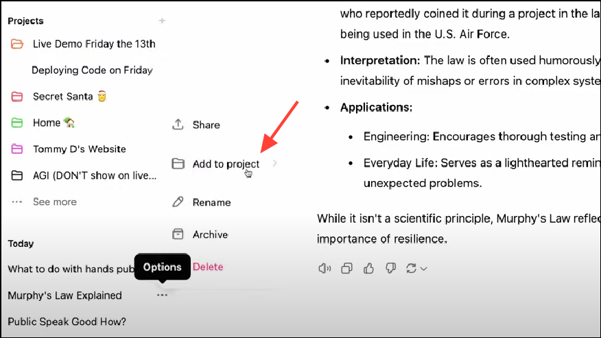 - Then click on 'Add to project' before selecting the Project to which you want to add the conversation. When you move a chat into a project, it will also start using the GPT-40 model, irrespective of which model it was using earlier. Additionally, the chat will use the context of the Project, and custom instructions for that Project will also affect the responses ChatGPT provides in that chat.