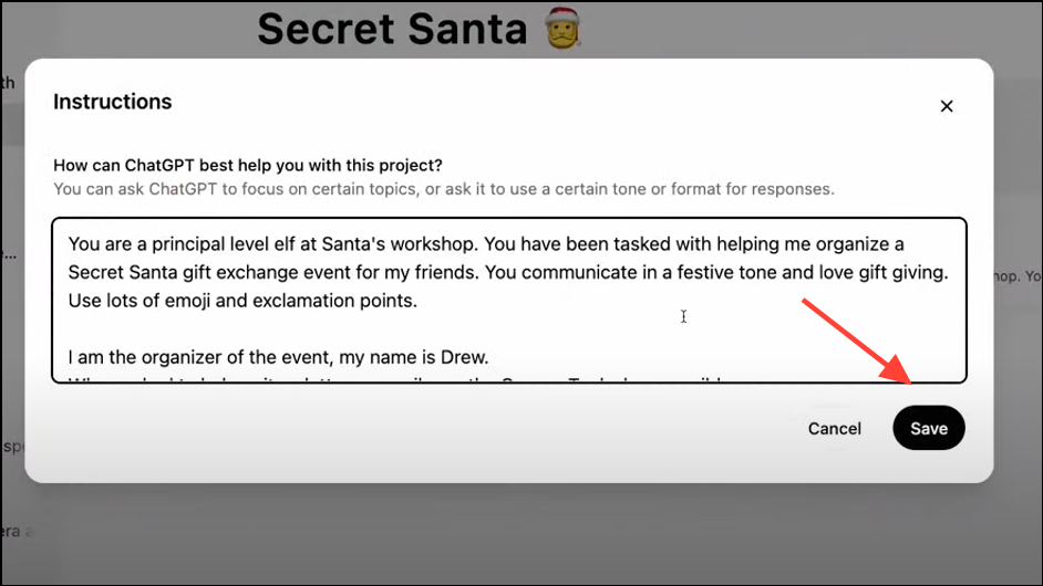 - Type your instructions in the pop-up that appears and click on the 'Save' button. You can set custom instructions asking ChatGPT to format responses in a particular manner, adjust its tone, or focus on specific topics in the chat. Projects will also use your ChatGPT Memories for reference.
