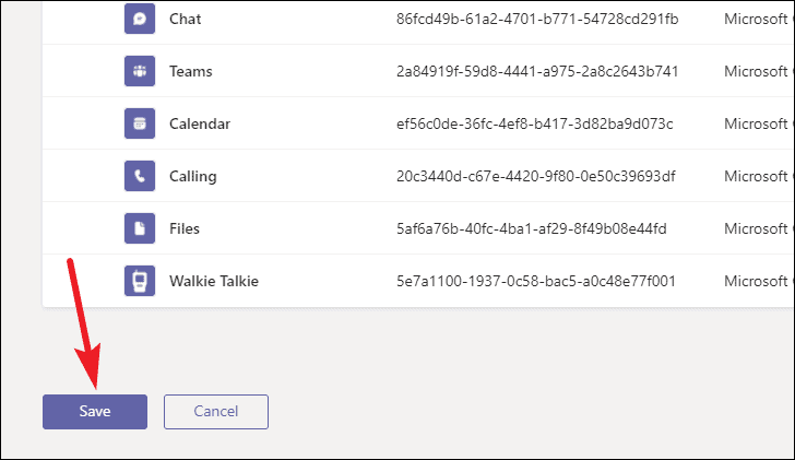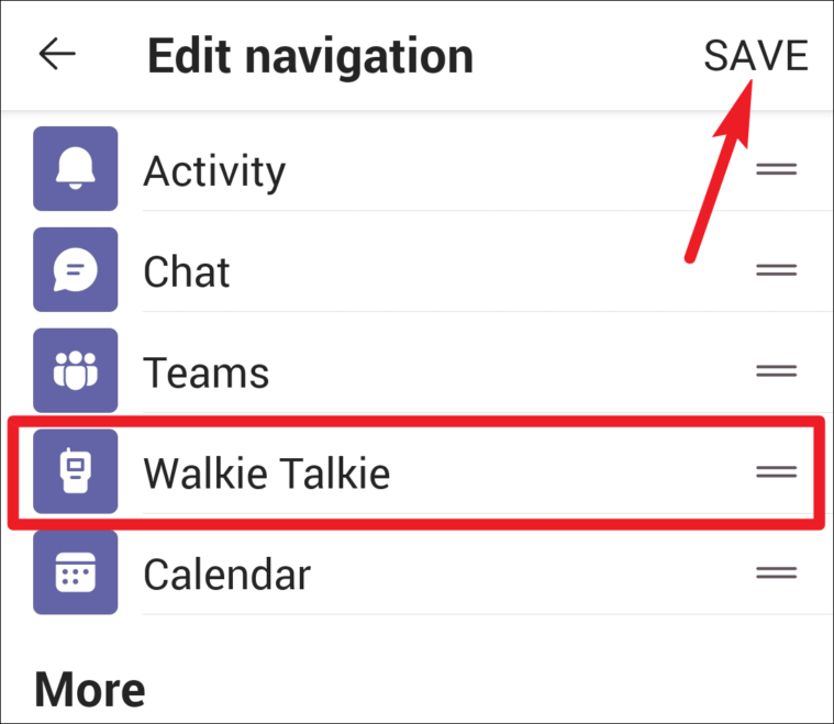 Tap and hold ‘Walkie Talkie’ and drag it to the pinned apps section. Place it in the order you want it to appear on the menu bar and leave it. If the menu bar already had the maximum number of apps it could display, the last app on the list would automatically move to the ‘More’ section. Tap the ‘Save’ button in the top right corner.
