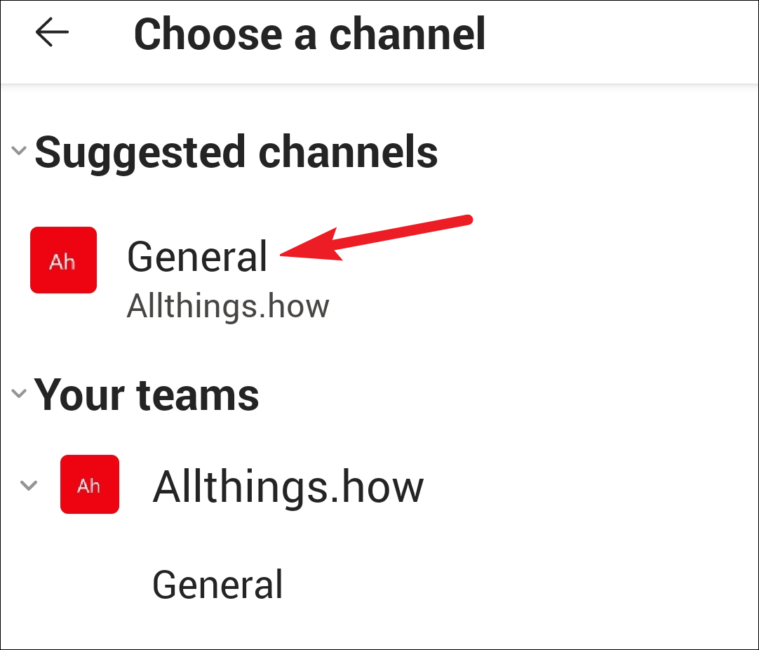 A list of channels in your Microsoft Teams will appear. Tap a channel to select it.