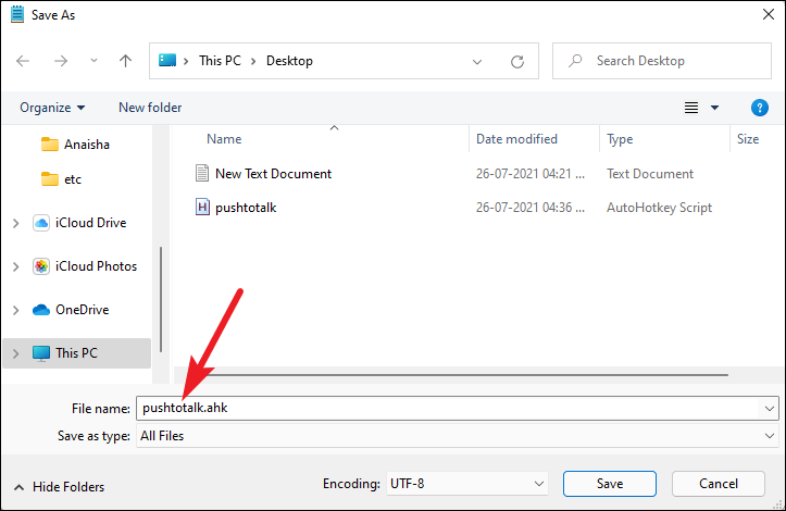 Save the file with the extension “*.ahk” and select ‘All Files’ as the file type while saving it.
