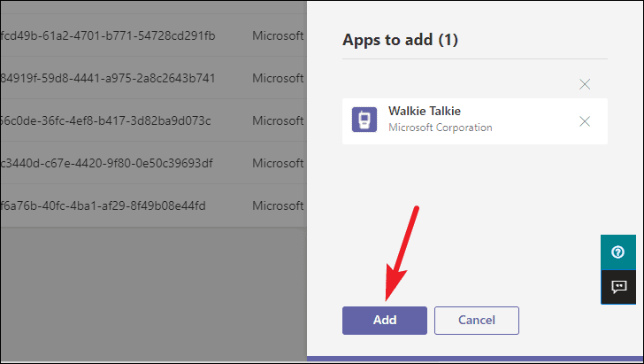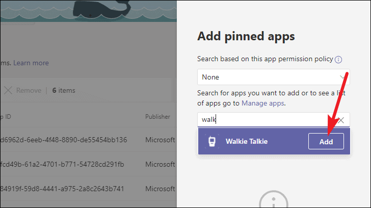 A panel will appear on the right. Search for ‘Walkie Talkie’ and click the ‘Add’ button to add it to the roster of pinned apps.
