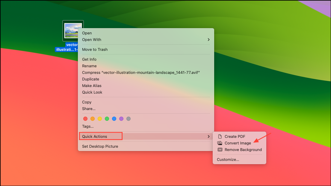 Step 2: Right-click (or control-click) the selected file(s), navigate to the "Quick Actions" submenu, and then choose "Convert Image" from the list of available actions.
