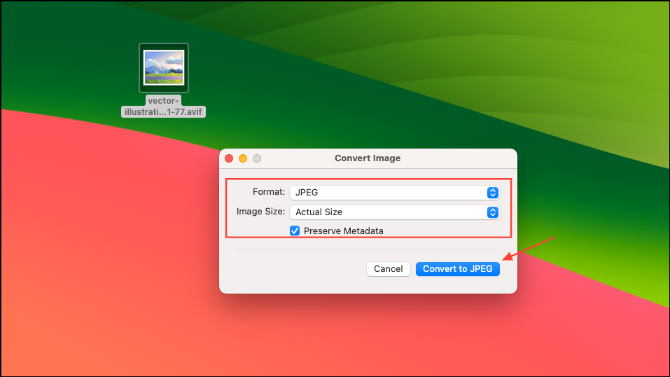 Step 3: A small dialog box will appear, allowing you to select the desired output format—JPEG, PNG, or HEIF. You can also choose the image size or keep it at "Actual Size" if resizing is not necessary. Decide whether to preserve metadata by checking or unchecking the relevant box, then click "Convert". The converted file will instantly appear in the same folder with the new format extension.