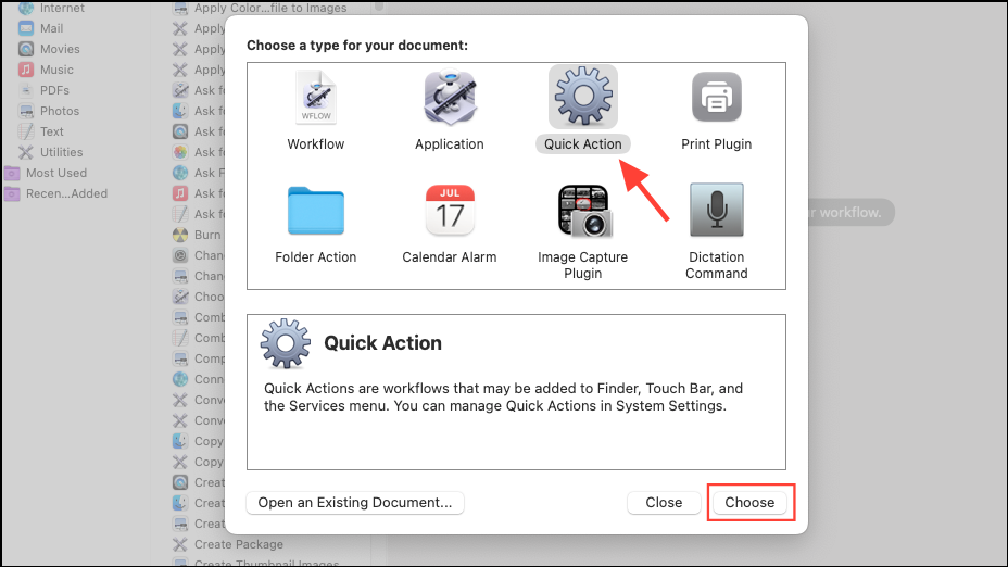 Step 1: Launch the Automator app, located in your Applications folder. From the initial template selection, choose "Quick Action" and click "Choose."