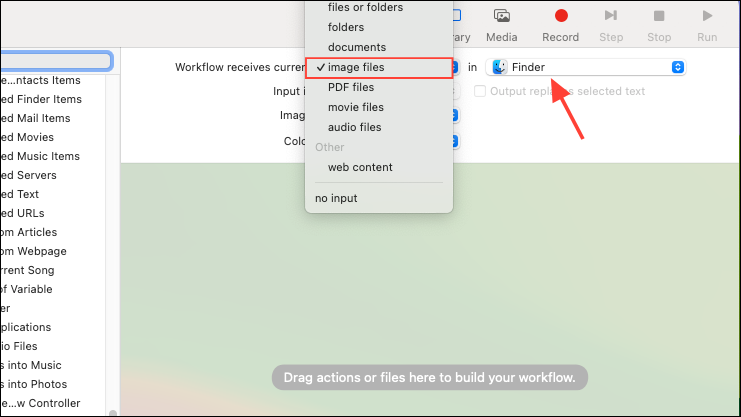 Step 2: At the top of the Automator workflow window, set the workflow input to "Image files" and ensure it is available in "Finder." This ensures your Quick Action appears whenever you select images in Finder.