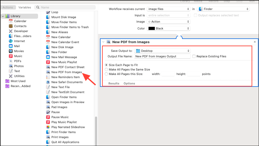 Step 3: In the left sidebar, find and drag the "New PDF from Images" action into the workflow pane. Configure the action settings, such as output file name and save location, to fit your preferences.