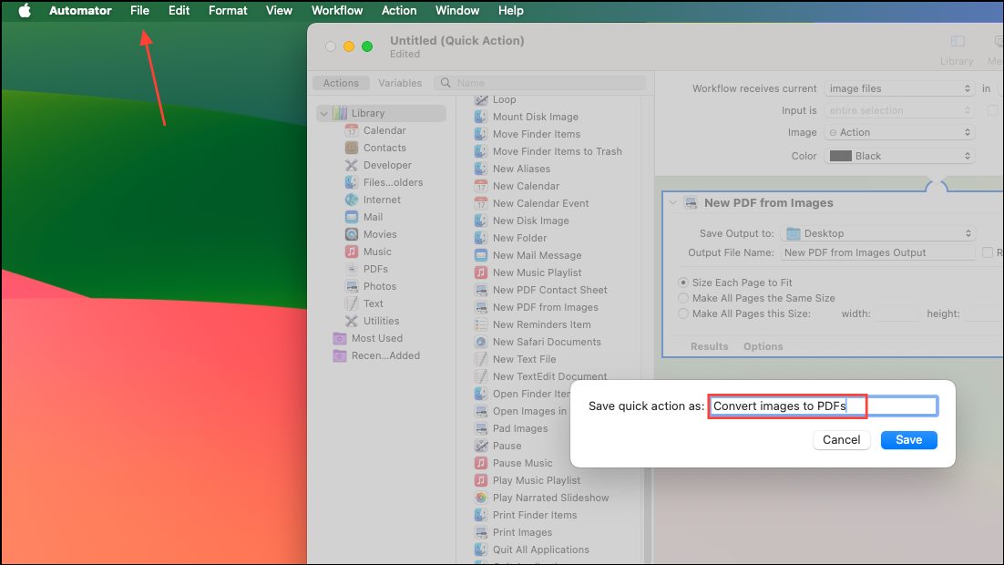 Step 4: Save your Quick Action by selecting File > Save, and give it a descriptive name like "Convert Images to PDF."