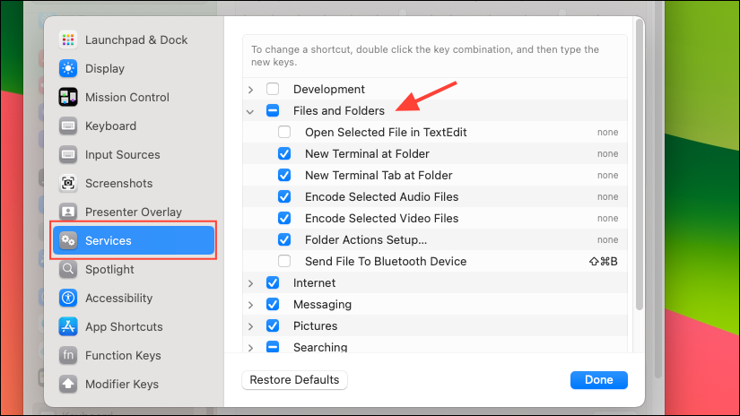 Step 2: Click on "Services" in the sidebar. Scroll down to the "Files and Folders" section, where you'll see your Quick Actions listed.
