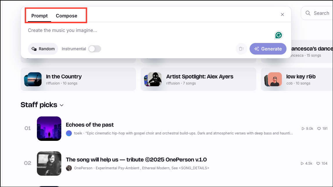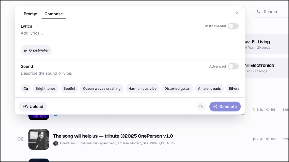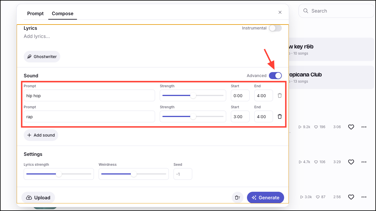 - The main difference between Prompt and Compose is that the latter gives you the option to separate lyrics and sound. There are also many advanced options which we'll talk about later. First, we'll focus on Lyrics, Sound, and Ghostwriter.
