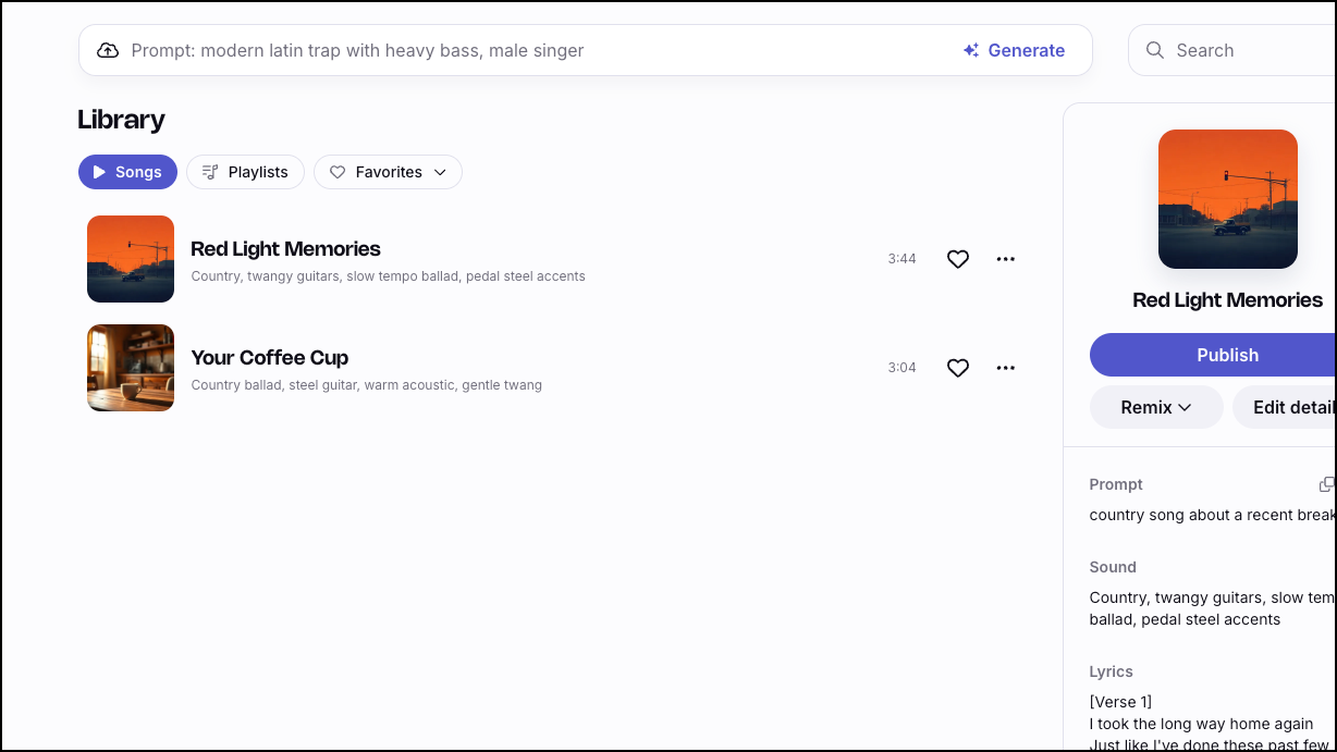 - Click on the 'Generate' button and the model will generate two songs for the prompt in your library. The songs will also have a thumbnail and a title.