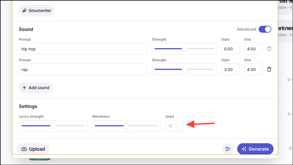 - The last option is for 'Seed'. Seed controls the randomness in song generation. Without a seed number, you'll get different songs even with the same prompt. But if you use a seed number, you'll get the exact same song every time you use that prompt with that seed number.