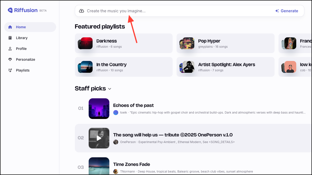 - This is the simplest way to create a song using Riffusion. Simply enter your prompt in the Create bar describing the type of song you want the tool to generate. For example, you could enter