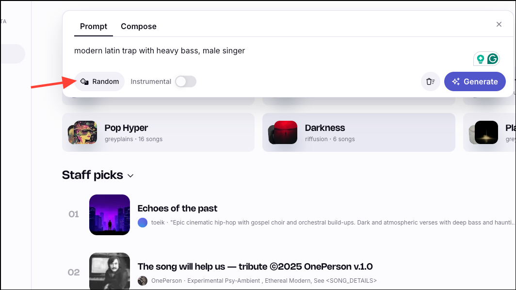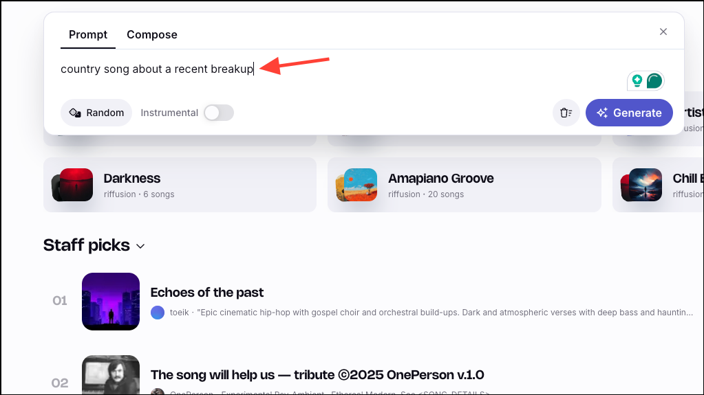 country song, female vocals, guitar riffs, breakup songwould steer the model in a better direction. - If you're having trouble coming up with a prompt, click on the 'Random' button to let the model roll the dice with a prompt.