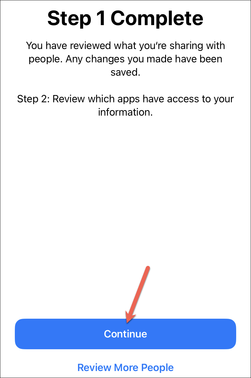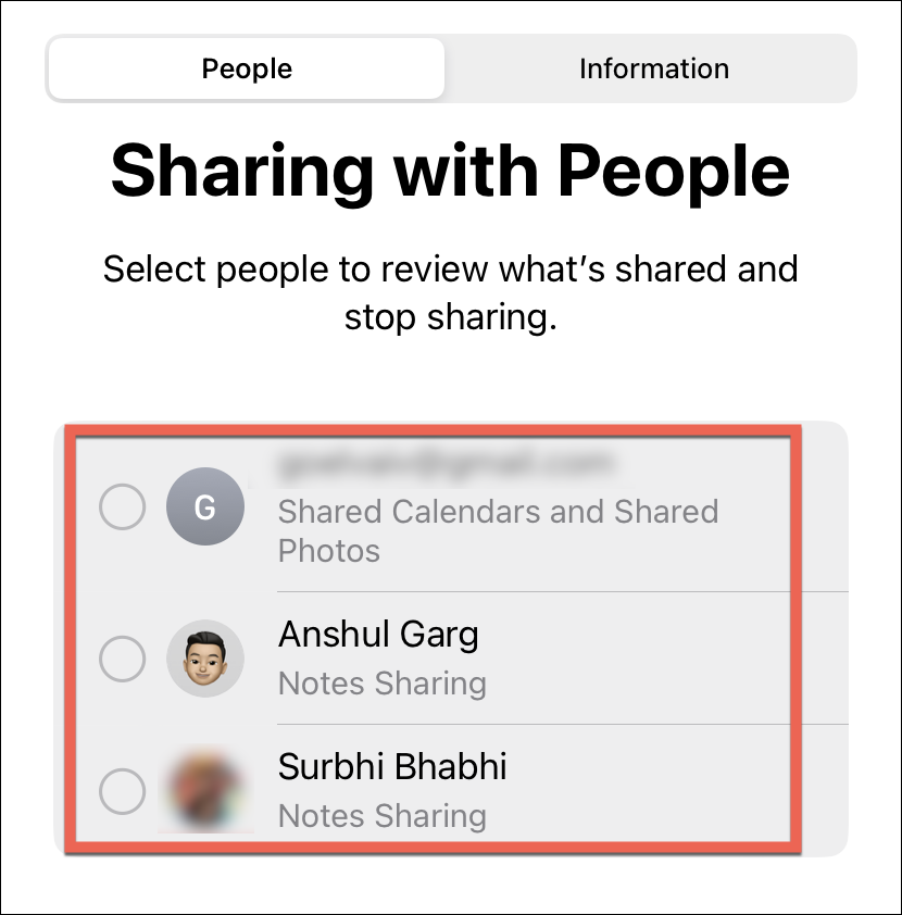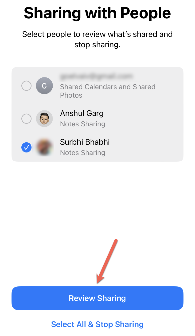 Select the people you want to review the access for and tap ‘Review Sharing’ at the bottom. To stop sharing information with everyone, tap ‘Select All & Stop Sharing’ at the bottom of the screen. If you don’t want to stop sharing access with anyone, tap ‘Skip’ without selecting anyone to move on to the next step, i.e., apps.