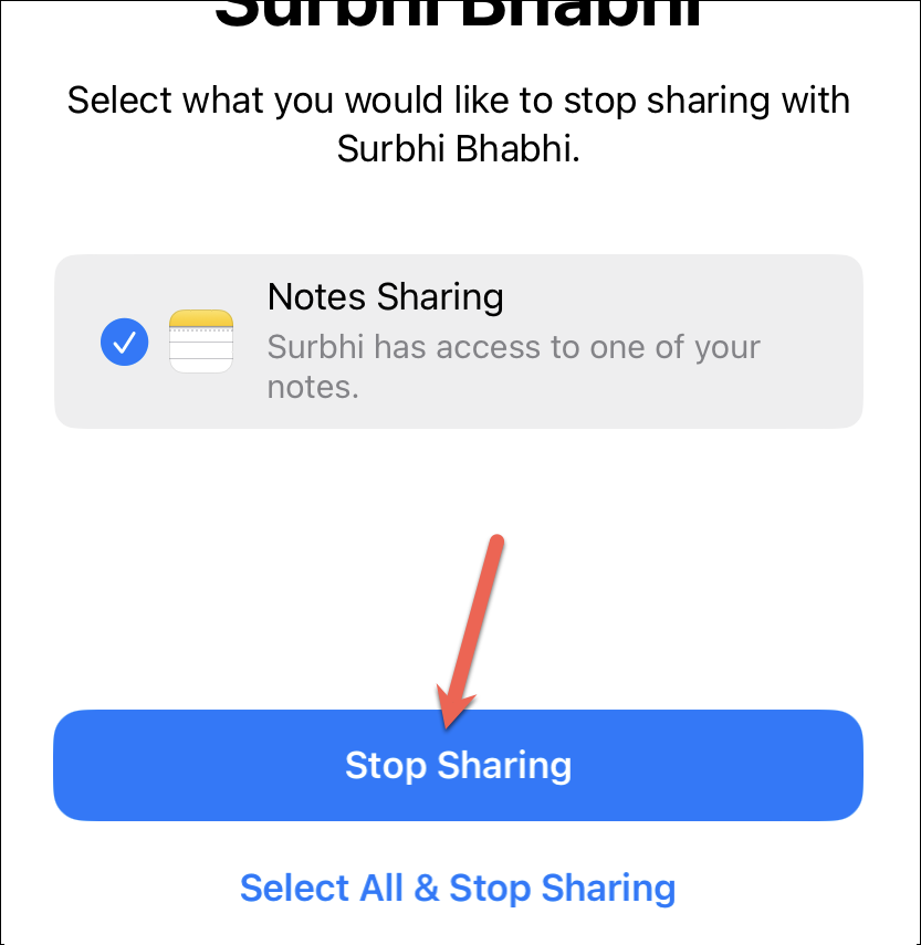 If you chose ‘Review Sharing’, you’ll see all the information being shared with each of the people one by one (if you chose more than one on the previous screen). Select the apps where you’d like to stop sharing access and tap ‘Stop Sharing’.