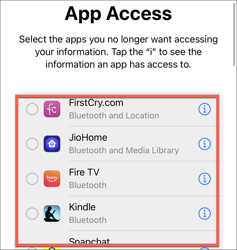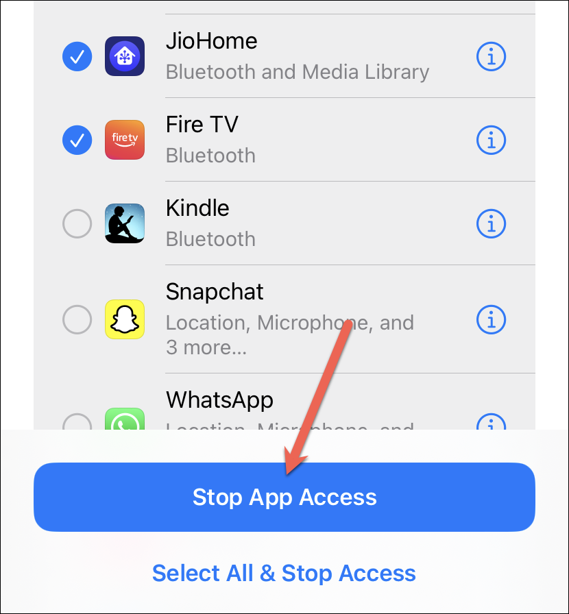Select the apps you want to stop the access for and tap ‘Stop App Access’ at the bottom. To stop sharing information with all the apps, tap ‘Select All & Stop Access’ from the bottom. You can also skip this step if you don’t want to stop access to any of the apps.
