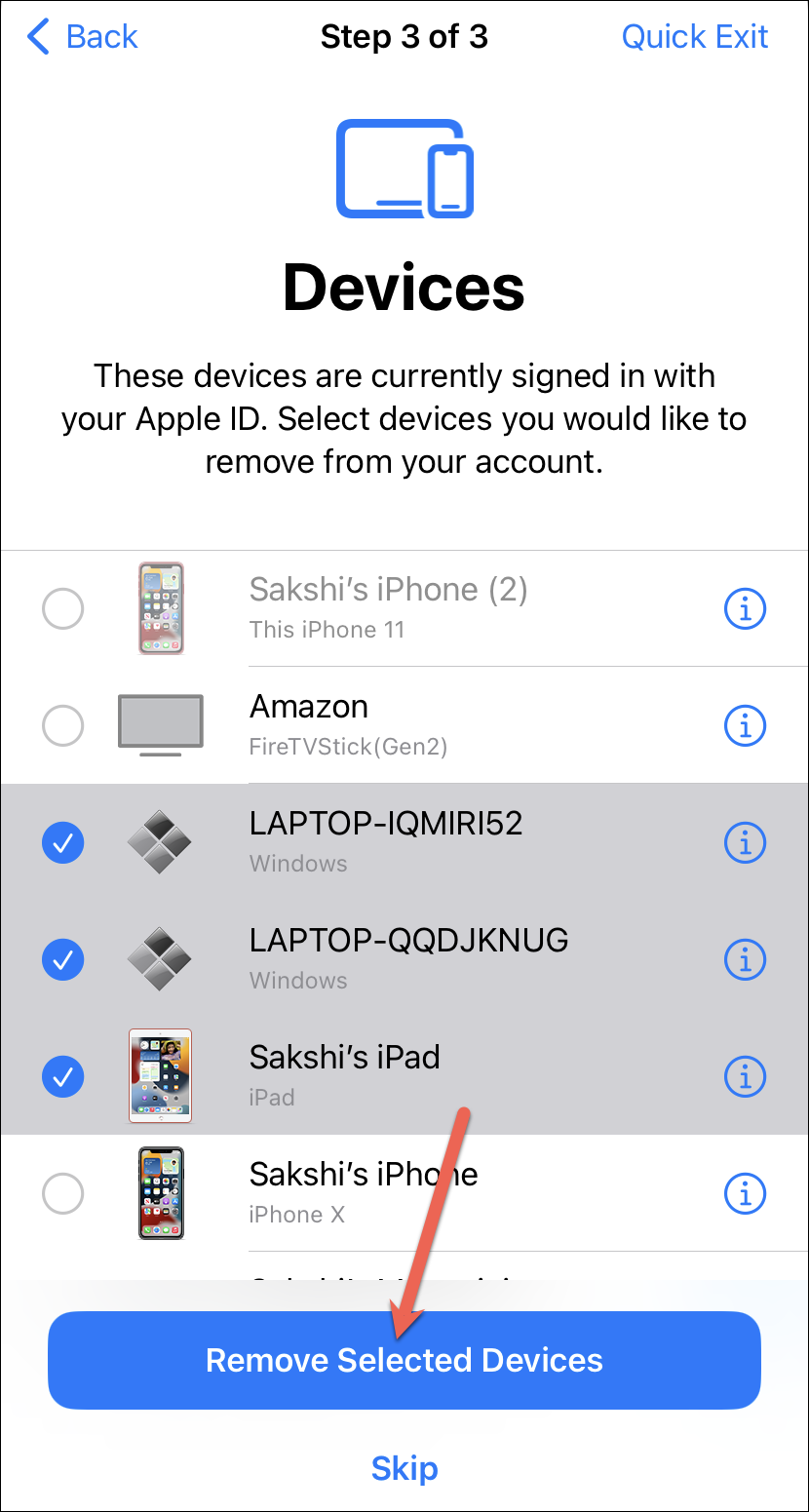 In the last step, all the devices where your Apple ID is currently signed in will appear. Select the devices you want to remove and tap ‘Remove Selected Devices’ at the bottom. Tap ‘Skip’ if you don’t want to remove any device.