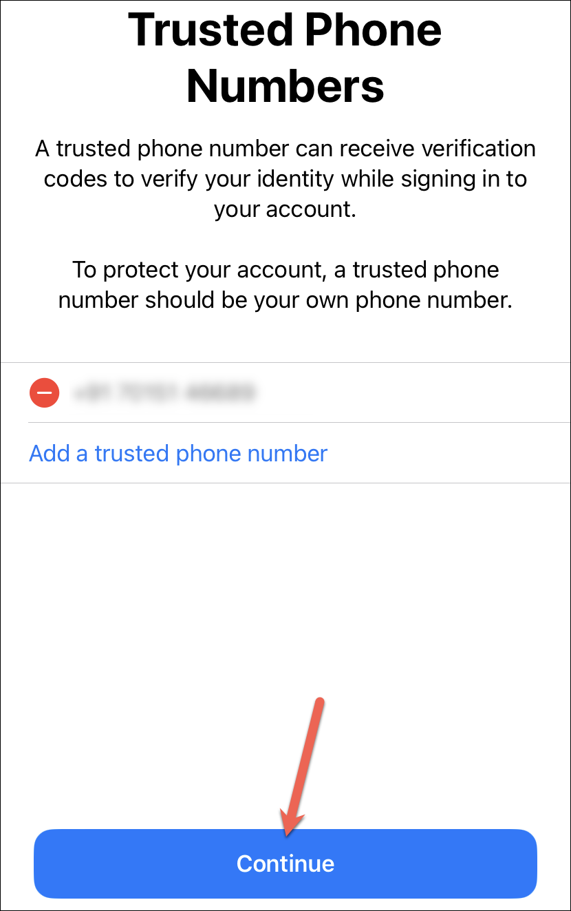 Then, review the trusted phone numbers where you can receive verification codes while signing in to your Apple ID. You can add new numbers, remove any number, or tap ‘Continue’ without making any changes.