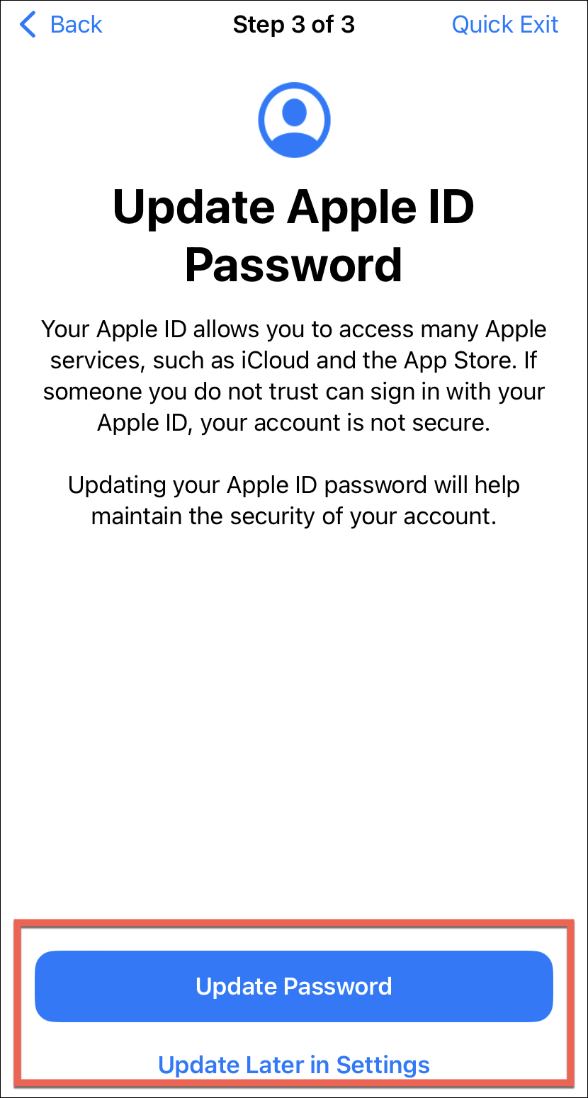 Then, choose whether you want to update your Apple ID password. Tap ‘Update Password’ to change it or ‘Update Later in Settings’ to leave it as it is.