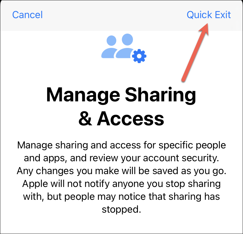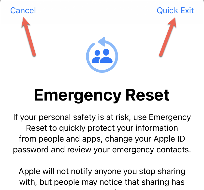 At any time, tap ‘Cancel’ in the upper-left corner of the screen to stop the emergency reset and get back to Safety Check settings. Or, tap ‘Quick Exit’ in the upper-right corner to close Safety Check settings in a hurry.