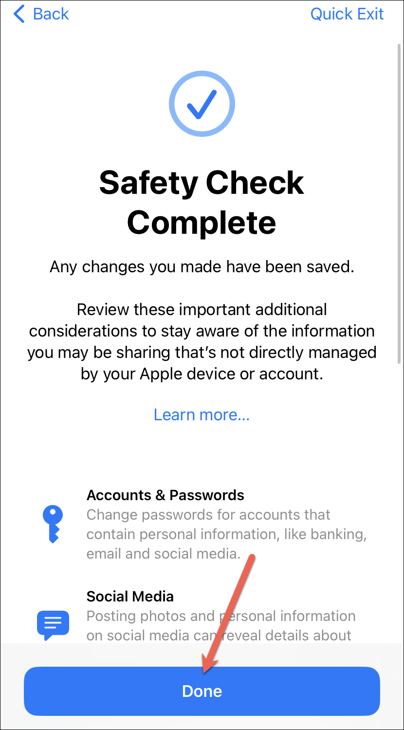 Your safety check is complete. Once you complete the safety check, your iPhone will also recommend additional considerations you should be aware of.