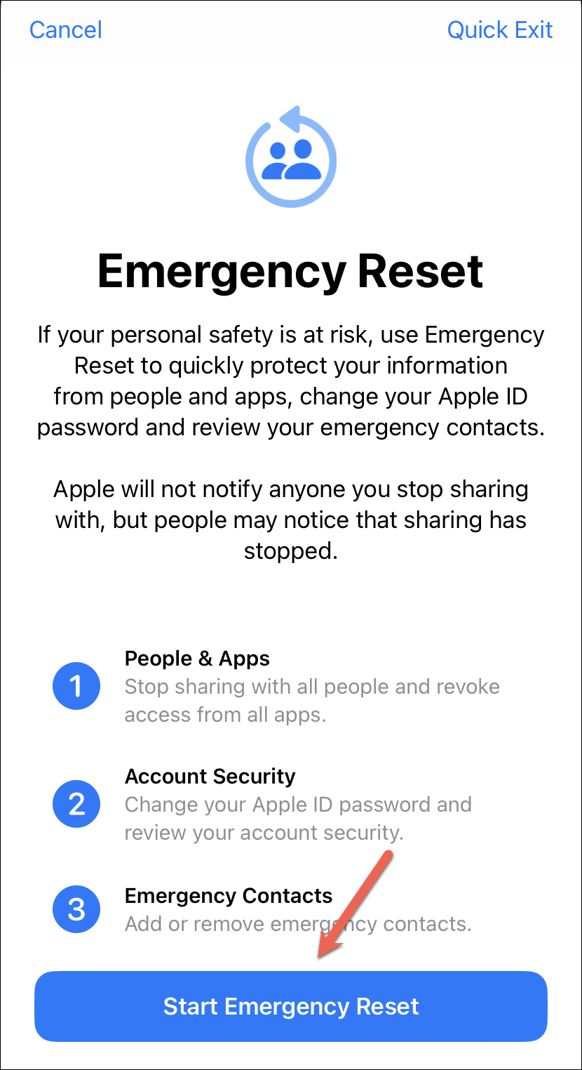 Then, follow the instructions on the screen to complete the emergency reset. Apple will not notify anyone that you have stopped sharing access with them. But you must note that people might notice on their own.