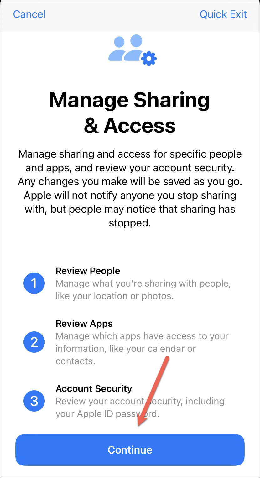 You’ll have to authenticate yourself using Face ID, Touch ID, or a passcode. The screen for Managing Sharing & Access will open; tap ‘Continue’ at the bottom to proceed.