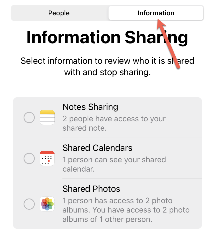 First, you’ll be able to see all the people you’re currently sharing any information with. Each tile for an individual will also list an overview of the information you’re sharing with them.