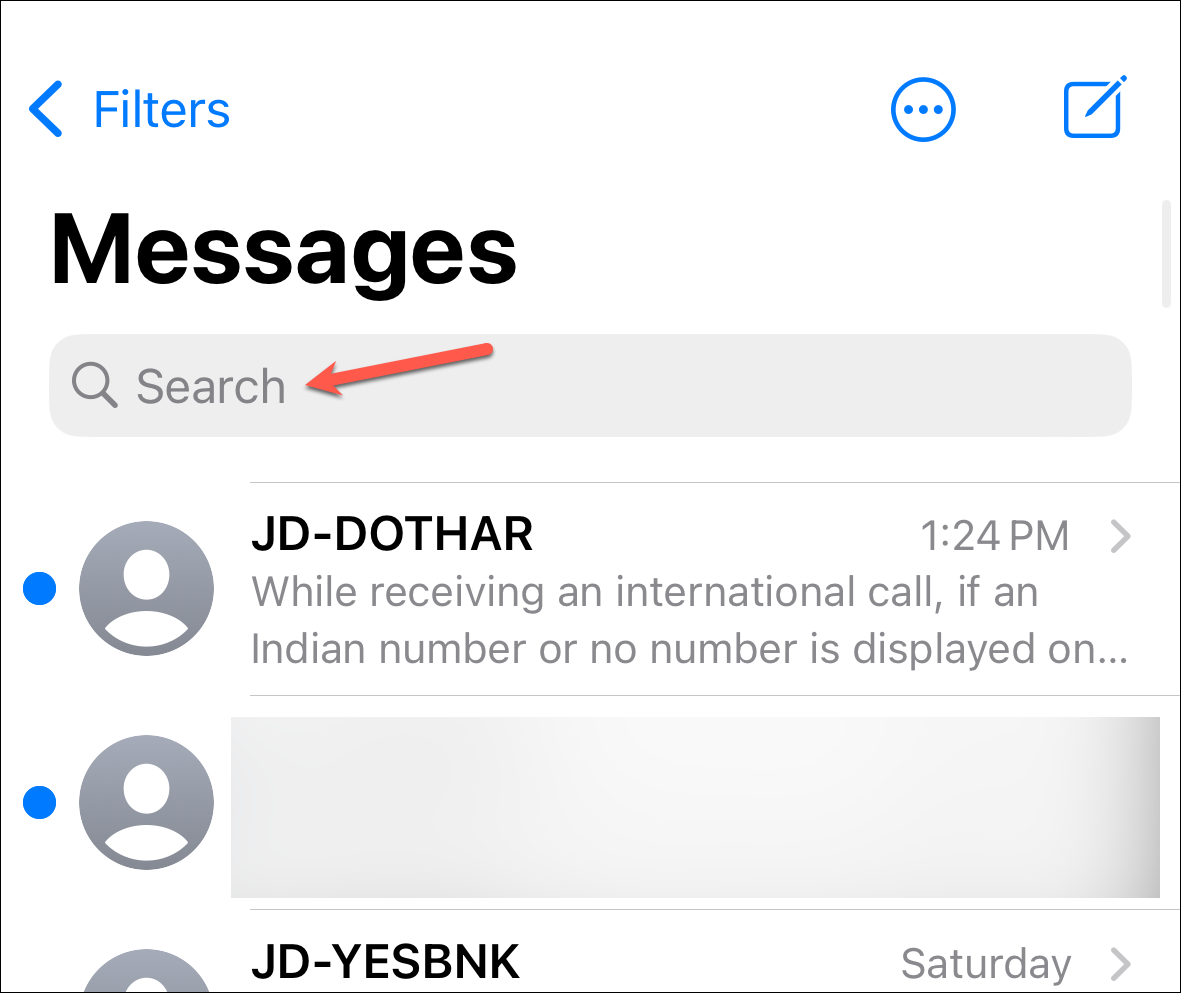 To use search filters, go to the Messages app, tap the Search Bar, and type one of these things in the search bar: 'name of a contact', 'photo', 'document', 'link', 'location', 'wallet' (for passes), etc. Then, select the filter from below the search bar.