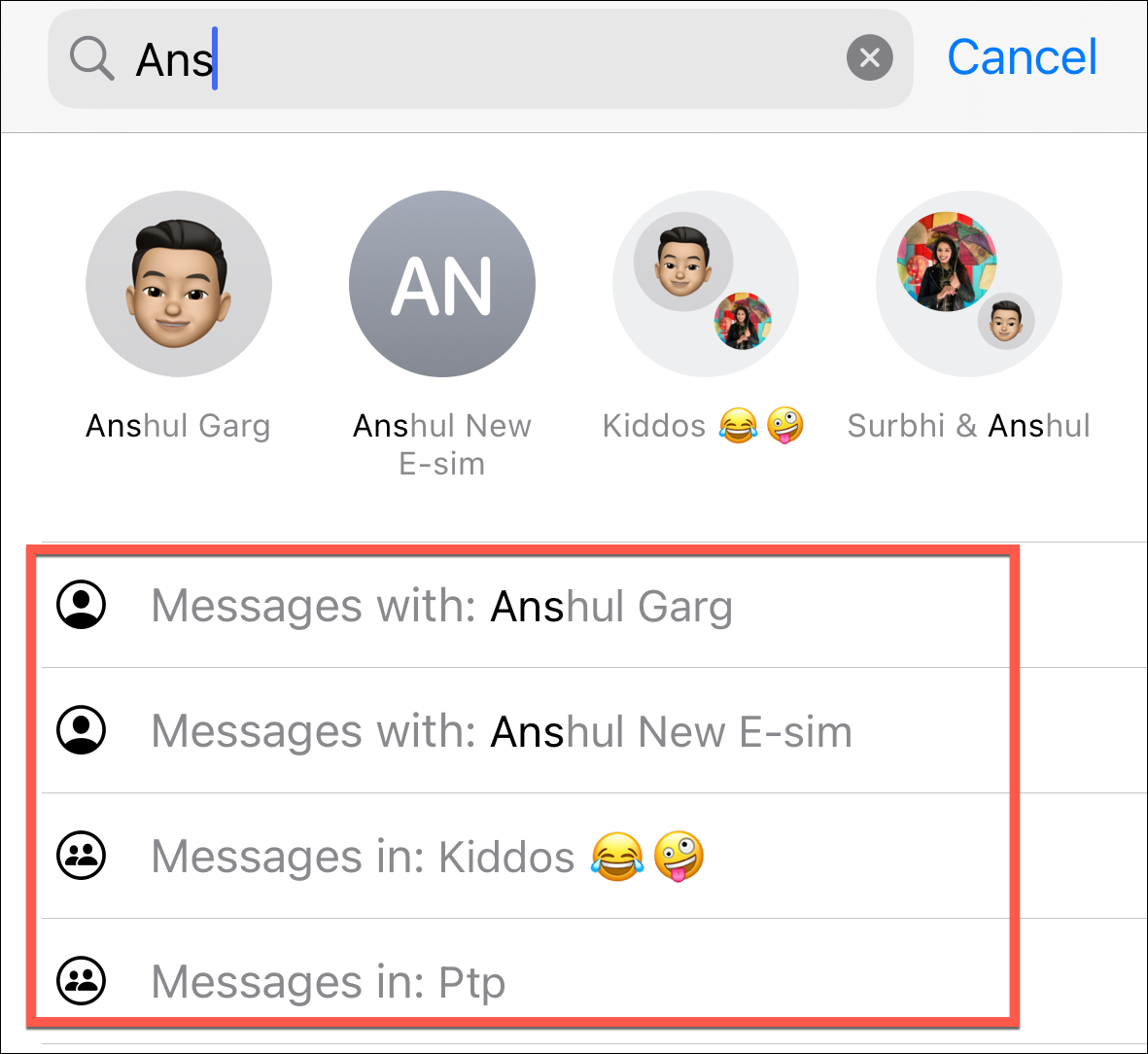 - As you start typing, corresponding filters will appear below the search bar; tap the one you want to use. For example, we'll start with the name of a person. The different search filters for them include 'Messages with: [Person]' or, if you're in a group chat with this person, 'Messages in: [Group Name]'.