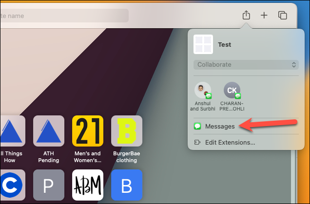 From the pop-up menu, either click the conversation from Siri suggestions if it is available there or click the ‘Messages’ icon to share the tab group.
