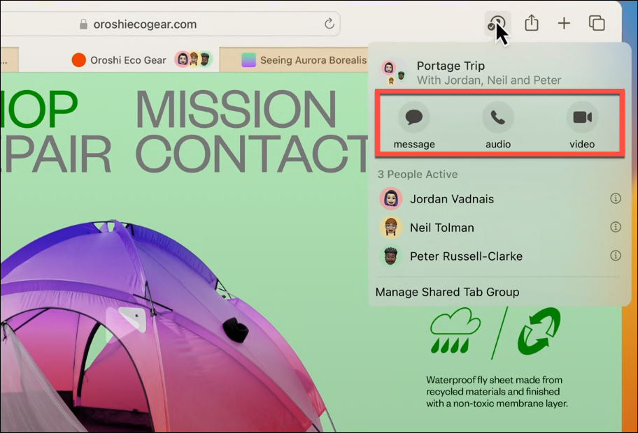You can also start a chat or FaceTime call in Safari. Open the Collaboration pop-over and click the ‘Message’ icon to chat while viewing the tabs. Messages will open in an overlay window over Safari so it’s easy to get back to Safari after you’re done chatting. To start a FaceTime call, click the ‘Audio’ or ‘Video’ options. You can also share your screen in the FaceTime video call to collaborate more closely on the shared tabs.