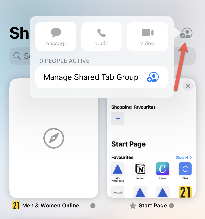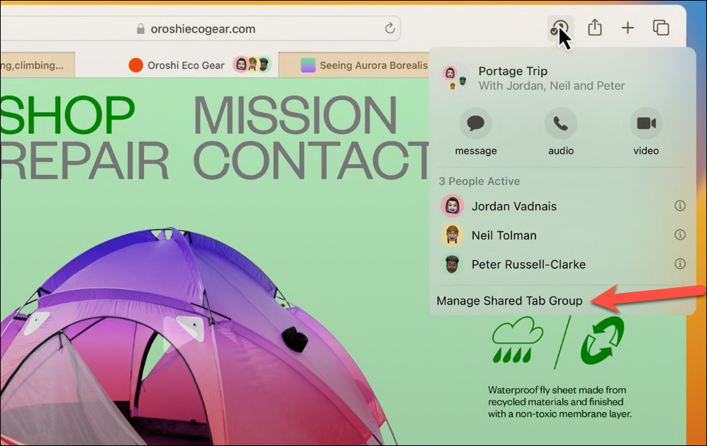To manage access for the shared tab group, like removing someone, or stop sharing it altogether, click the option for ‘Manage Shared Tab Group’ from the collaboration pop-over.