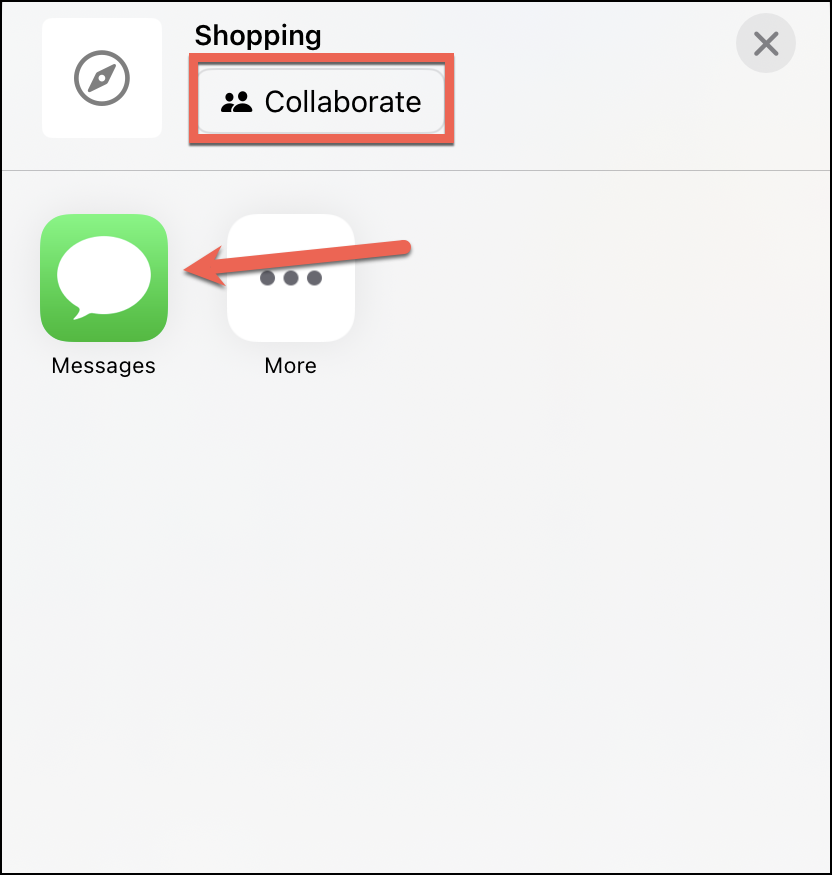 The Share Sheet will open. You’ll see that it has the option ‘Collaborate’ written there. And unlike other apps like Notes, where you can switch to ‘Send a Copy’, that option isn’t available here. Also, Messages is the only app available in the Share Sheet for shared tab groups. Select ‘Messages’ from the Share Sheet to share the invitation to the tab group.