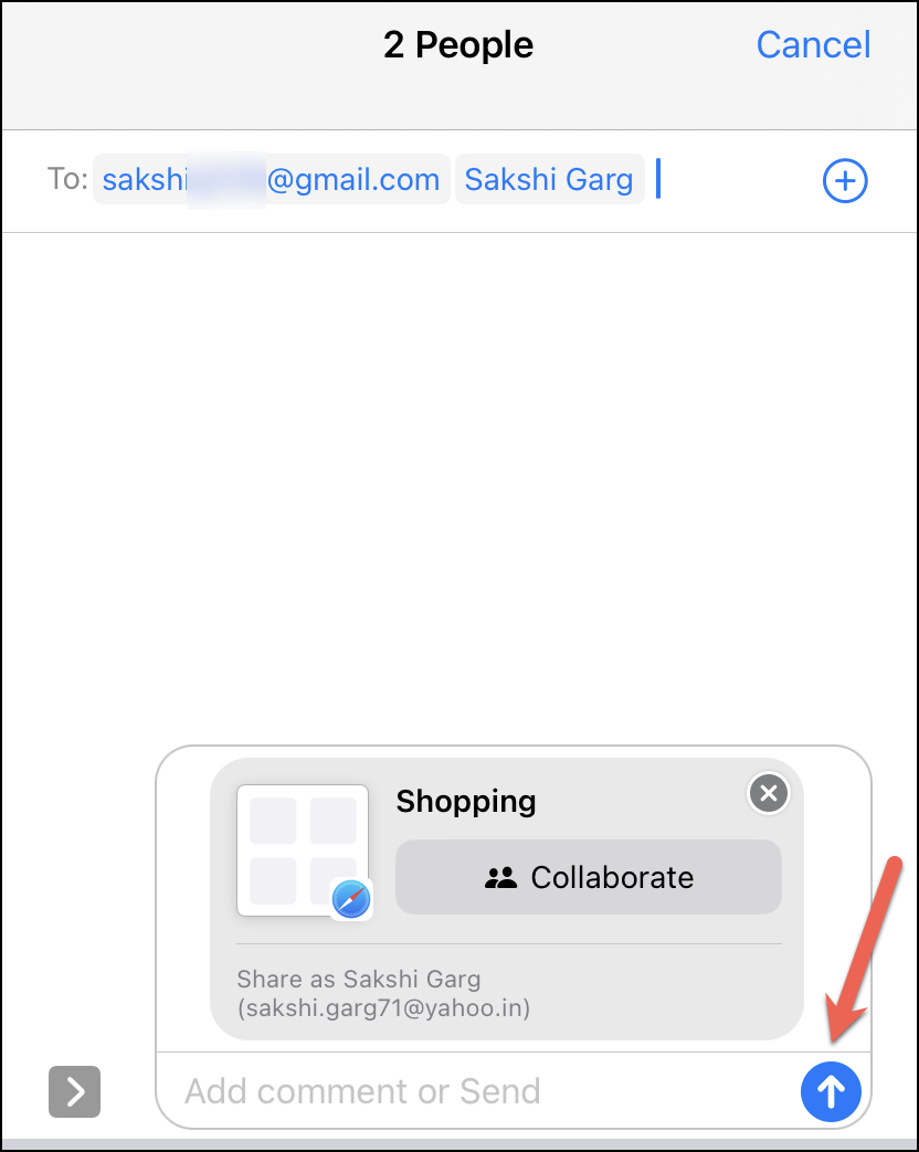 The ‘New Message’ screen will open in an overlay window and the invitation to collaborate on the tab group will load in the message box. Enter the name of the recipient(s) you want to invite in the ‘To:’ field and tap the ‘Send’ button to send the invitation.