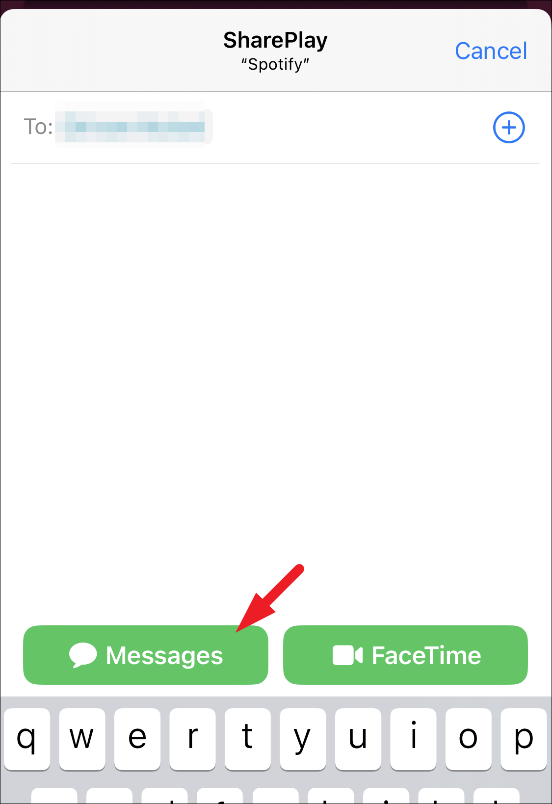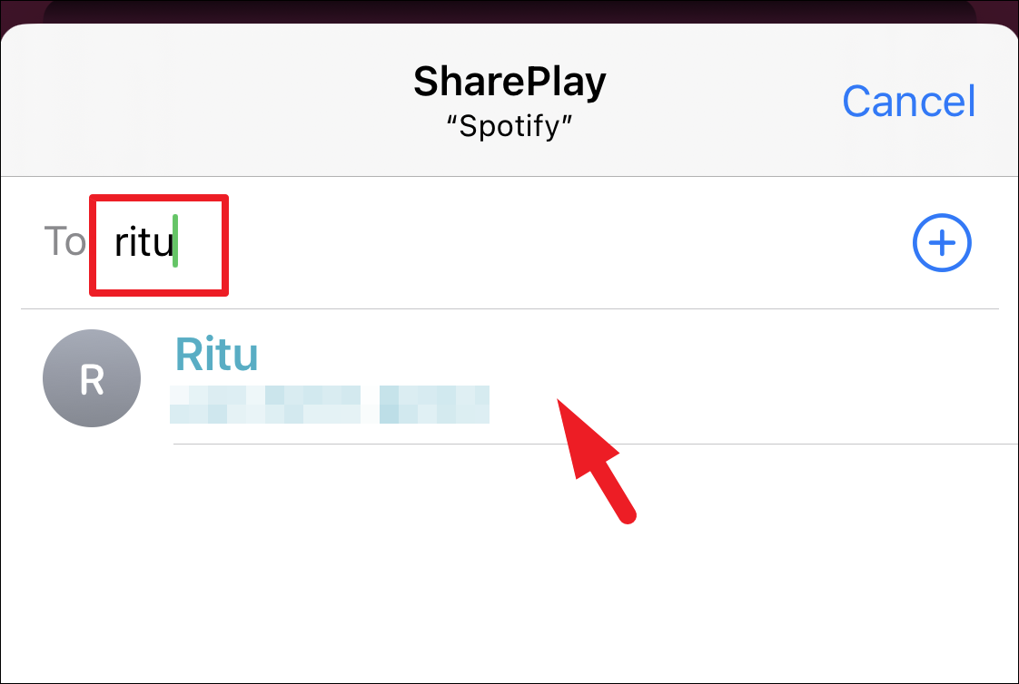 From the overlay menu, first, add the contact(s) you want to have the SharePlay session with. Search for a contact in the ‘To’ field and tap on the result to add them. Search for more contacts if you intend to add more participants to the session.
