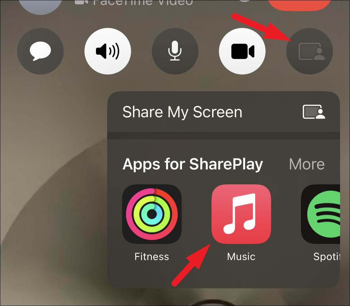 When on a FaceTime call, tap on the ‘Share my screen’ option. Next, navigate and tap on the app that you wish to use to stream media. To showcase, we will use the ‘Music’ app.