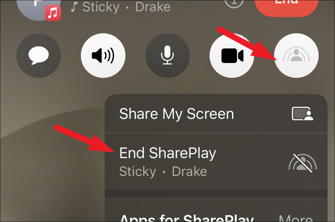 To end the SharePlay session, tap on the ‘SharePlay’ button on the tap bar and tap on the ‘End SharePlay’ option to proceed.