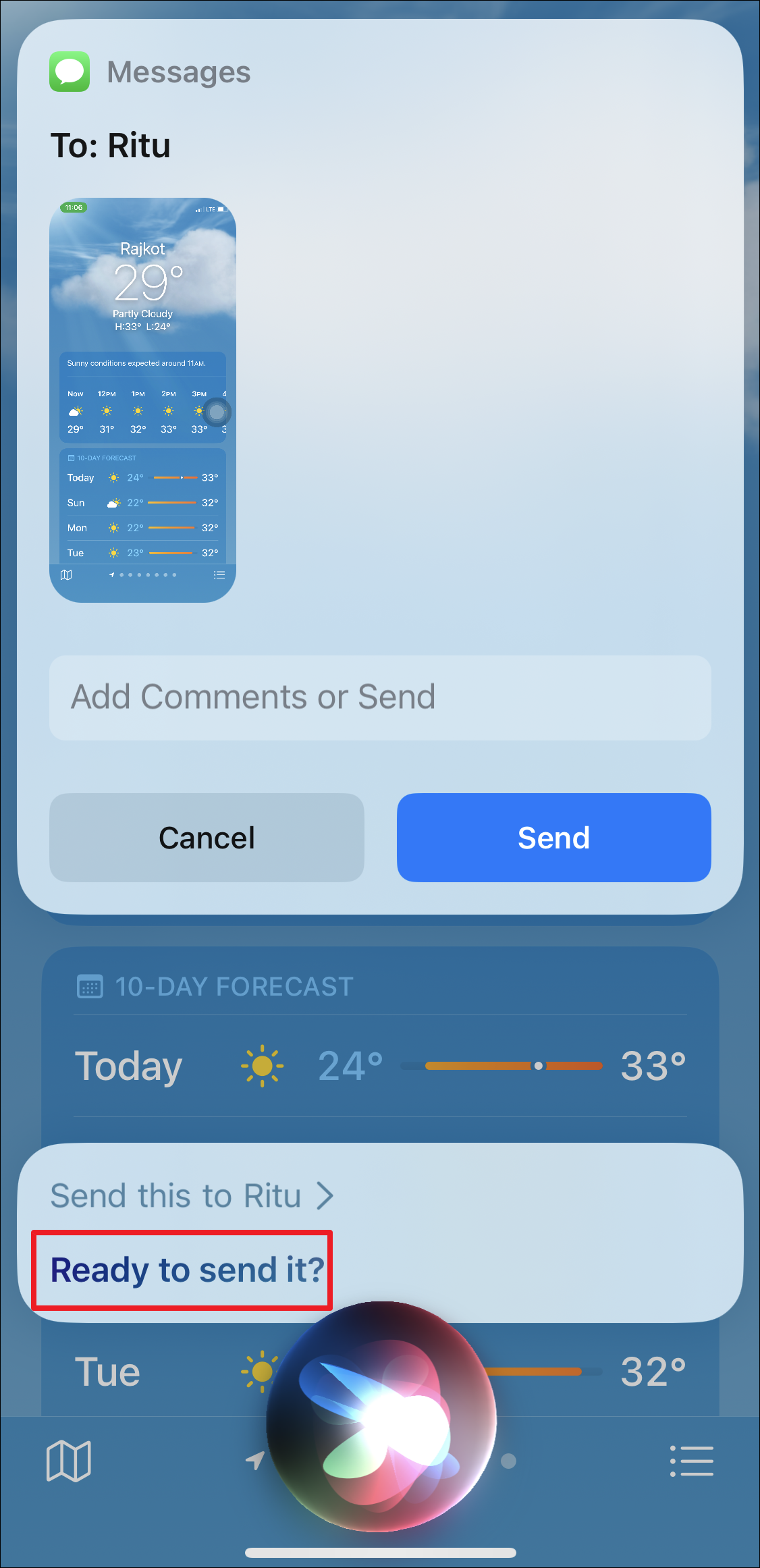 After loading the content, Siri will once confirm with you if you wish to send it. Confirm it by saying “Yes” or “No”. You can also type a message in the text box provided, if you wish.