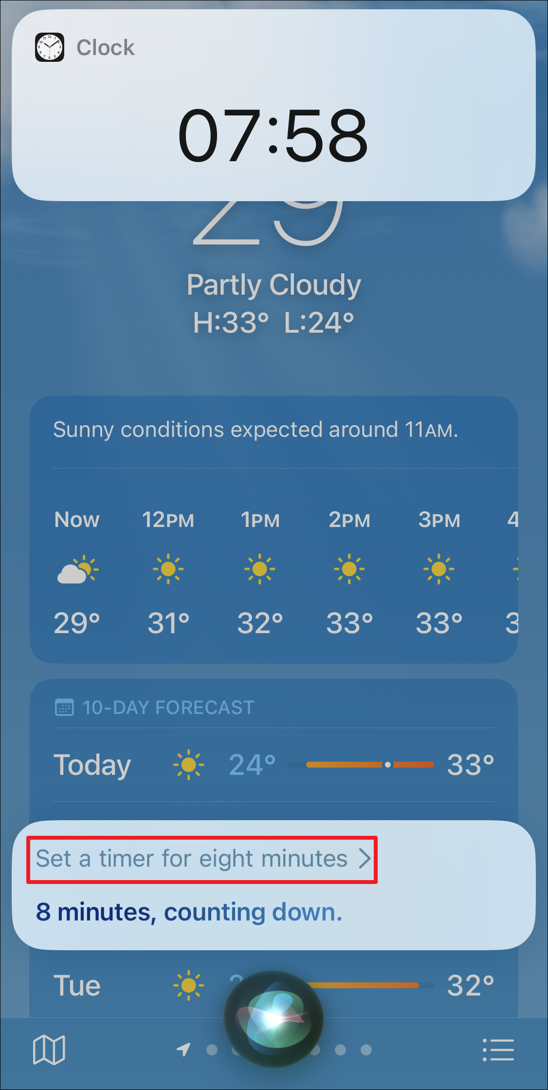 To create a reminder/ alarm/ timer on your iPhone, say, “Hey Siri, set an alarm for 7 AM tomorrow/ remind me to review documents at 3 PM today/ set a timer for 8 minutes” and Siri shall do so.