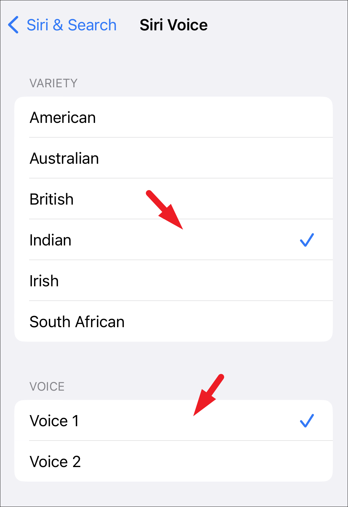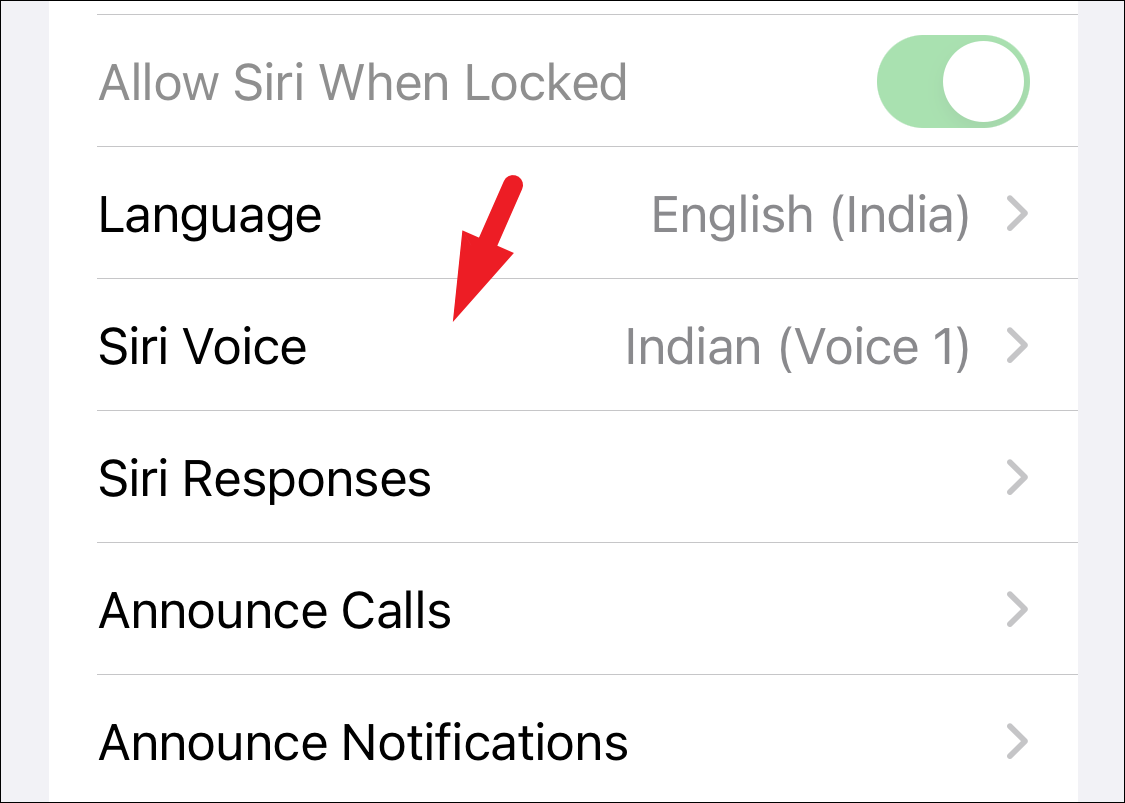 To change Siri’s voice, tap on the ‘Siri Voice’ tab from the Siri settings page.
