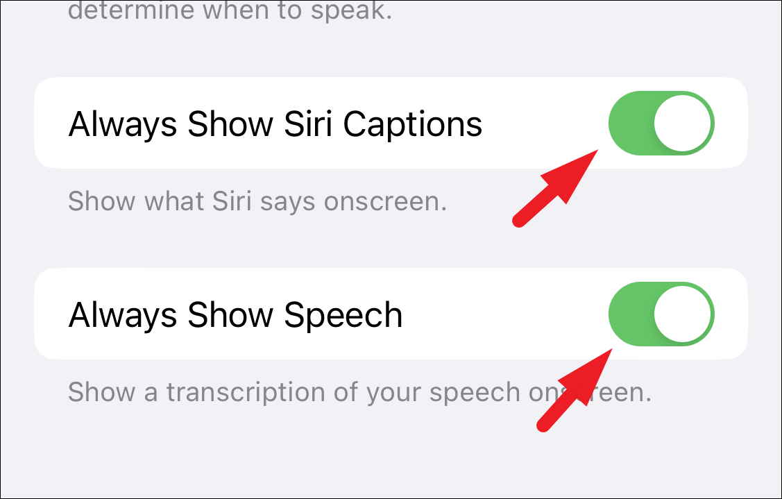 Next, if you wish to see captions of what Siri speaks, toggle the switch on following the ‘Always Show Siri Captions’ option. Similarly, if you wish to see a transcription of your speech always, toggle the switch to the ‘On’ position following the ‘Always Show Speech’ option.