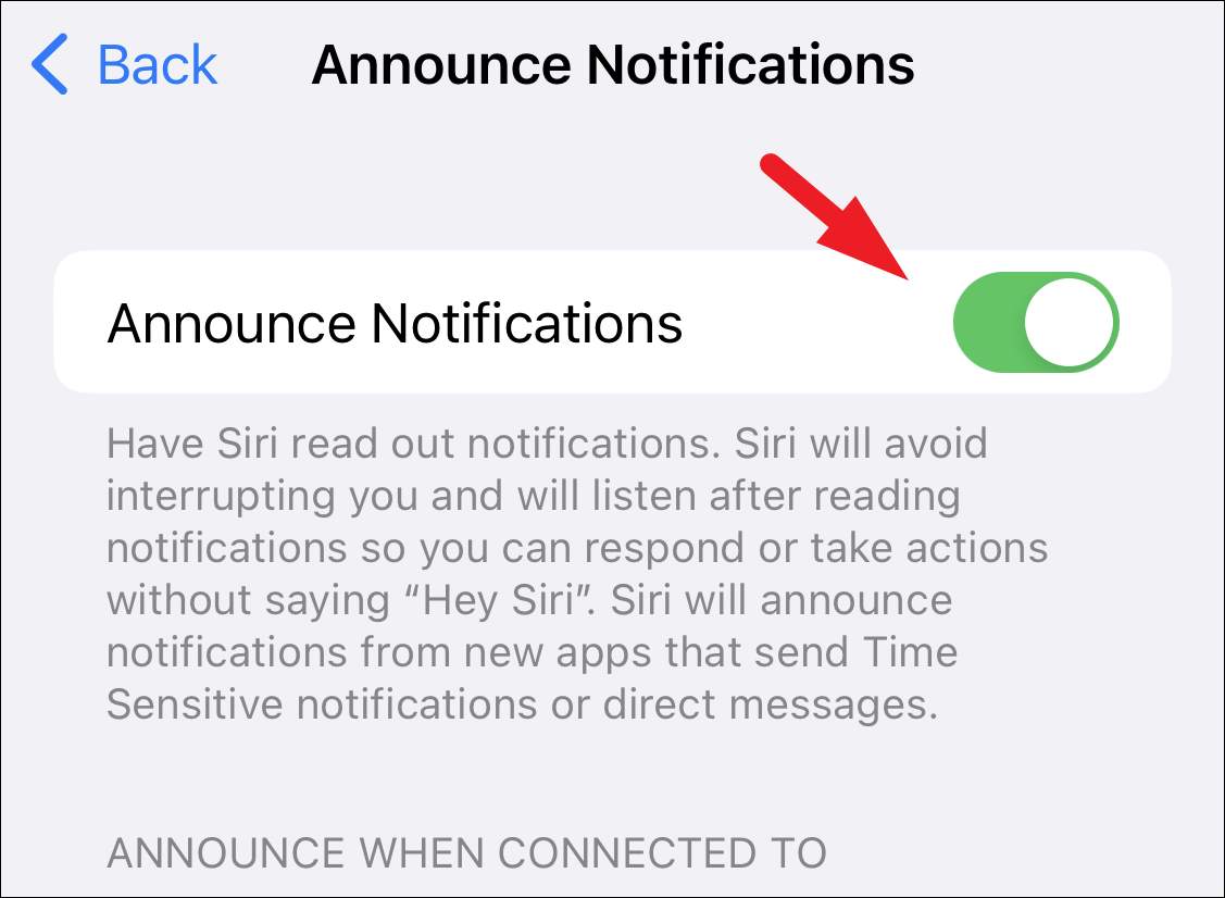 After that, tap on the toggle switch following the ‘Announce Notifications’ option.