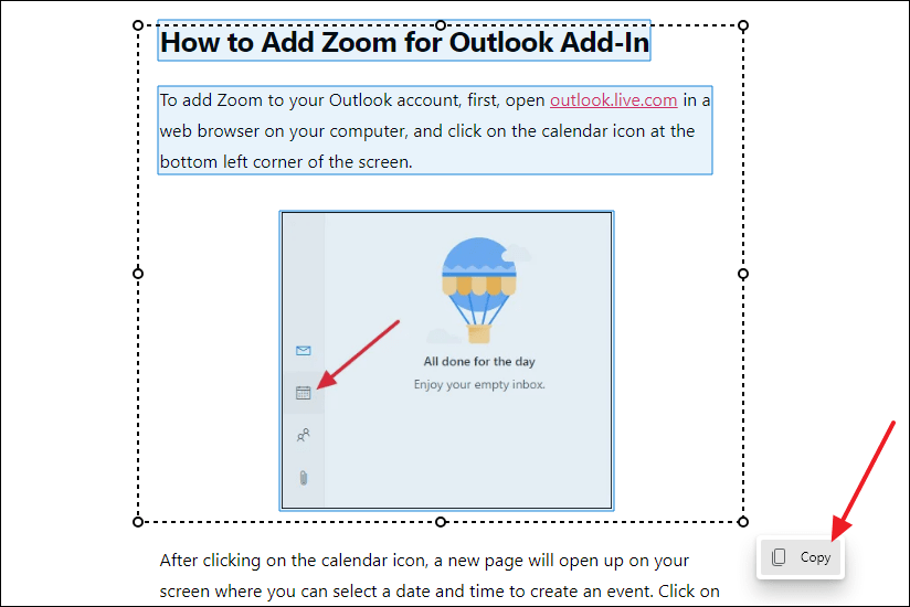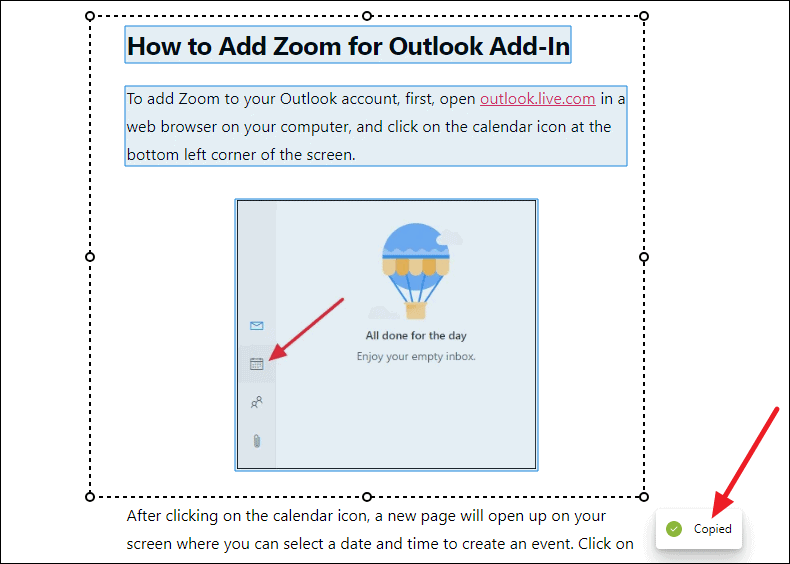A confirmation message saying Copied will appear, and the selection box will disappear.