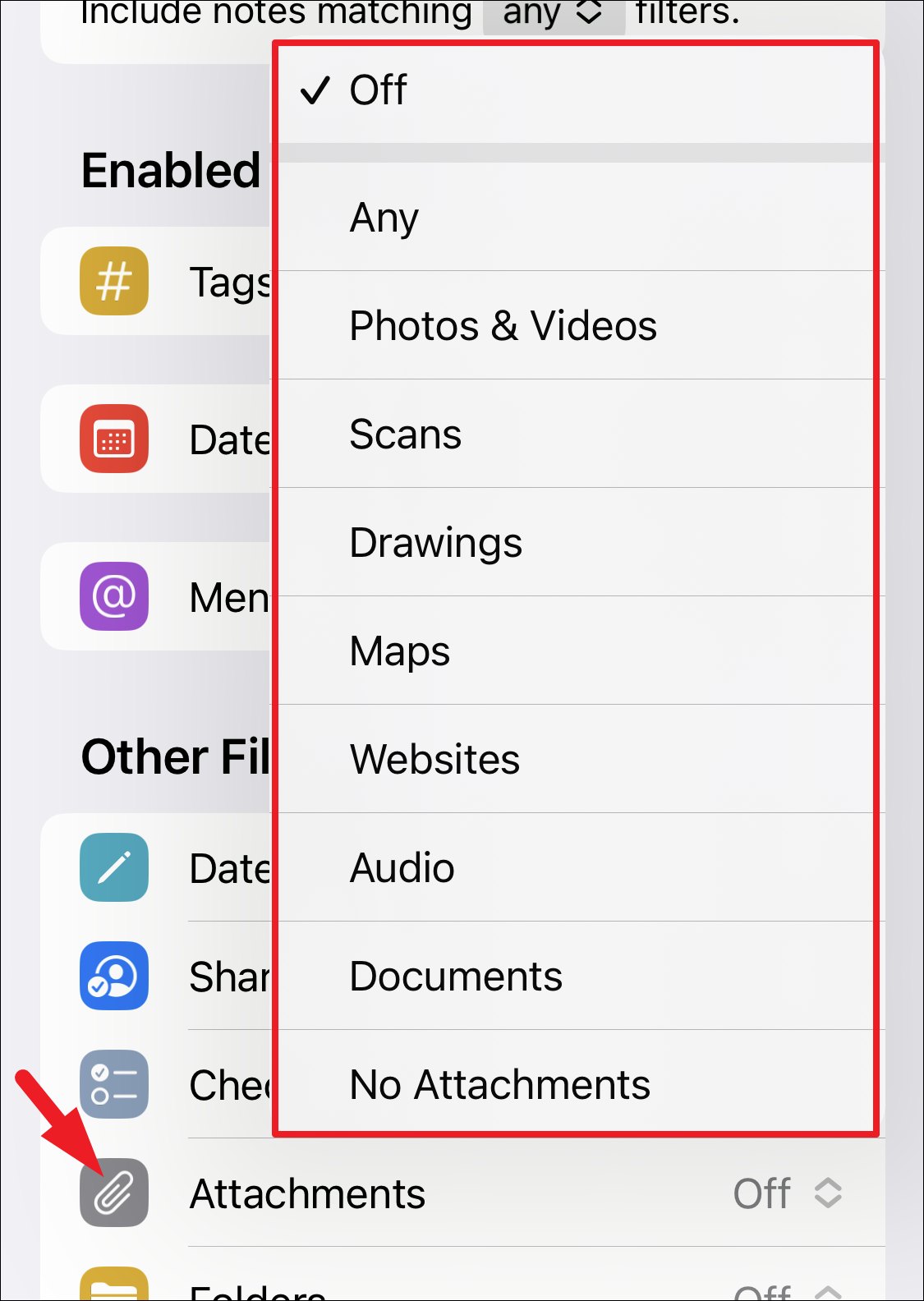 Now, to include notes in the smart folder on the basis of their attachment type, tap on the ‘Attachment’ tab and choose the category you wish to include. Otherwise, tap on the ‘No attachments’ option to include the notes that do not have any attachments.