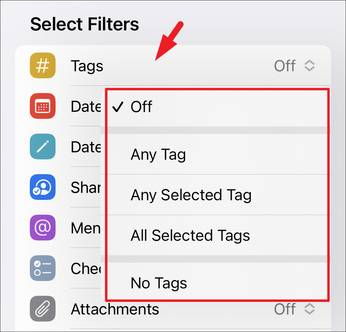 For instance, tap on the ‘Tags’ tab and tap on the relevant option from the context menu. To provide you a gist, ‘Any Tag’ will include notes that have any tag in them. The ‘Any Selected Tag’ feature will include all the notes that have at least one of the tags that will be defined by you in the next step. Similarly, the ‘All Selected Tags’ will include only the notes that have all the defined tags.